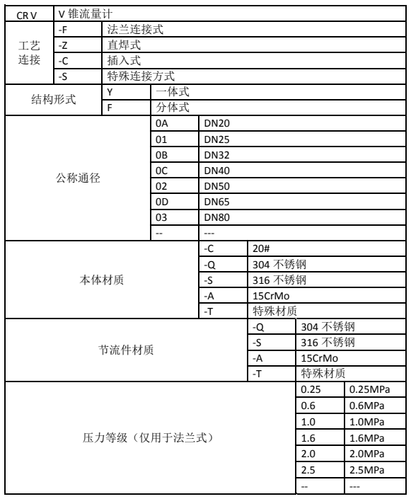 例:CR V-F Y 04 -C -Q 1.6 : V锥流量计,一体式法兰连接,公称通径为DN100,本体材质为20#,节流件材质为304,压力等级 1.6MPa。